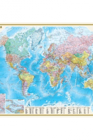 Dvuchstoronnyaya nastennaya karta razmerami 1170ch790 mm sostoit iz dvuch kart masshtaba 1:32 000 000 (v 1 sm 320 km). Na fizicheskoj karte mira blagodarya udachno podobrannoj cvetovoj shkale vysot i glubin s mnozhestvom gradacij naglyadno pokazan rel′ef sushi Zemli i dna Mirovogo okeana. Podrobno otrazhena gidrologicheskaya set′ materikov. Privedeny nazvaniya vsech osnovnych morfostrukturnych form zemnoj poverchnosti (gornych sistem i chrebtov, ravnin, nizmennostej i pr.). Osnovnaya karta dopolnena vrezkami na Arktiku i Antarktidu, a takzhe kartami «Klimaticheskie poyasa» i «Prirodnye zony sushi». Na Politicheskoj karte predstavleny vse nezavisimye gosudarstva mira, vklyuchaya Rossiyu v novych granicach, a takzhe vladeniya i territorii s osobym statusom. CHorosho razlichimymi punsonami pokazany naselyonnye punkty s gradaciyami «bolee 1 mln zhitelej», «ot 100 tys. do 1 mln zhitelej» i «menee 100 tys. zhitelej». Osnovnuyu kartu dopolnyayut vrezki v bolee krupnych masshtabach na Evropu i Karibskij region, a takzhe karta «Plotnost′ naseleniya». V tablichnom vide privedeny dannye o krupnejshich stranach mira po naseleniyu, ploshhadi, a takzhe ob osnovnych gorodskich aglomeraciyach mira.